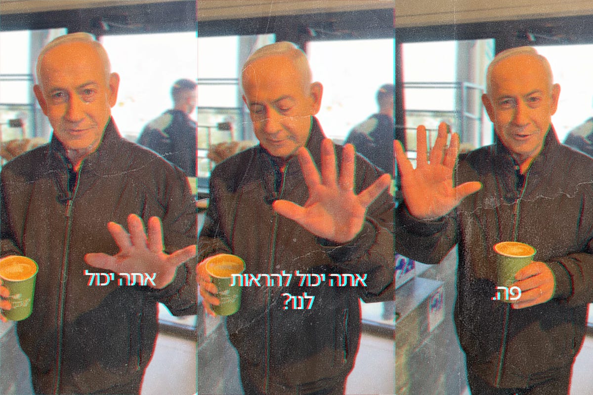 Dopo aver sorriso, Netanyahu sorseggia un caffè lungo da un bicchiere di carta e consiglia a chi sta guardando “di stare vicino a un’area protetta”.